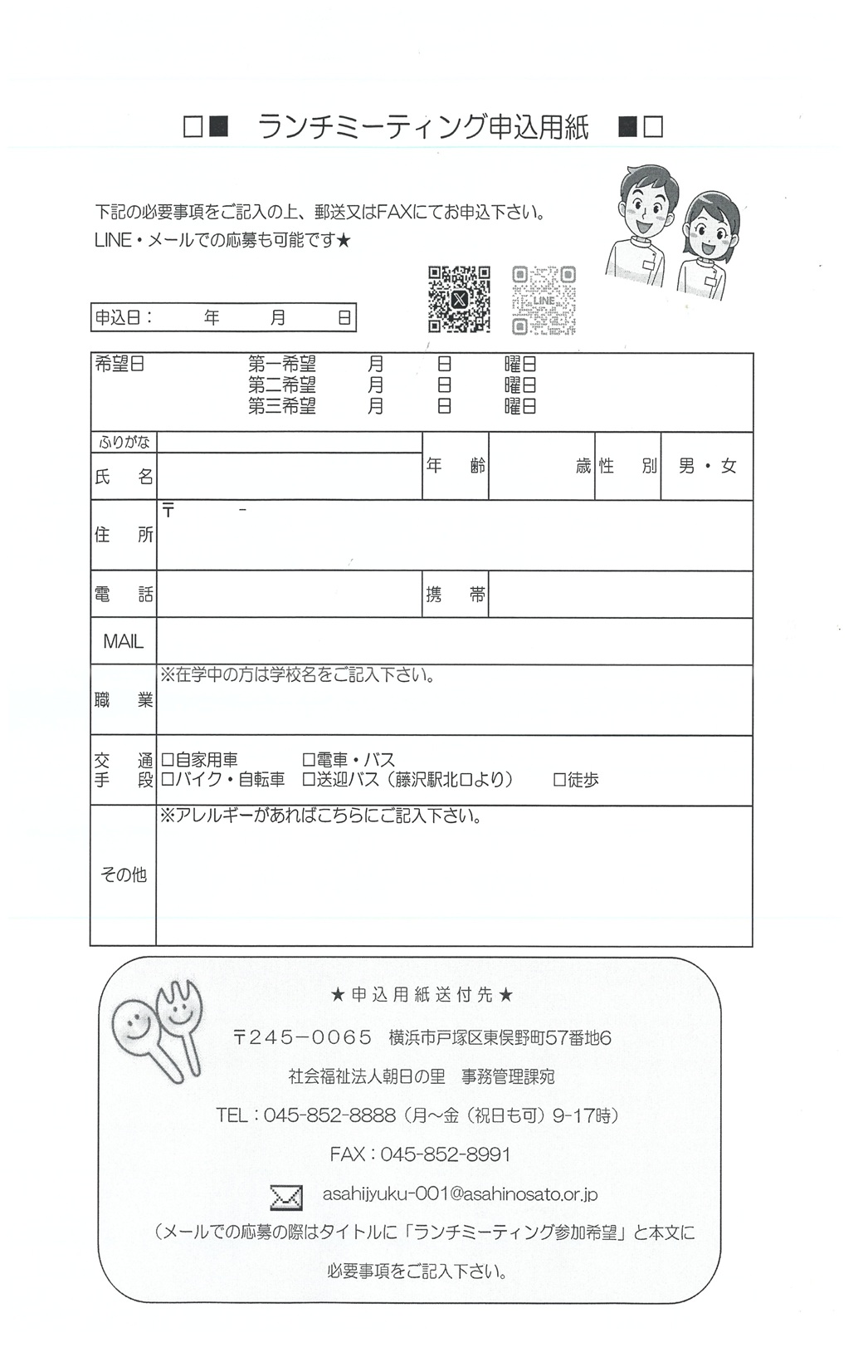 | 応募方法 | 郵送・お電話・メール・LINE・X(旧twitter) ◆応募用紙にご記入の上お申込下さい。 ◆メール・LINE・Xの方は必要事項をご記入頂きお申込下さい。 【必要事項】 ・タイトル:ランチミーティング参加希望 ・お名前 ・年齢 ・性別 ・郵便番号 ・ご住所 ・電話番号 ・メールアドレス ・職業 ・交通手段(自家用車、電車・バス、バイク・自転車、送迎バス、徒歩 |